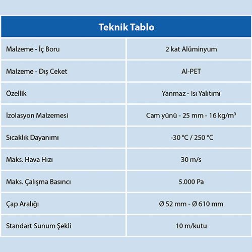 Yüksek gerilimli çelik tel, alüminyum polyester laminasyonu kullanılarak imal edilmiş borunun üzerine şilte tipi camyünü kaplandıktan sonra polyester laminasyonlu alüminyum malzeme ile ceketlenerek ISO 9001-2008 kalilte yönetim sistemi ile TS EN 13180 standardına uygun olarak imal edilir.
